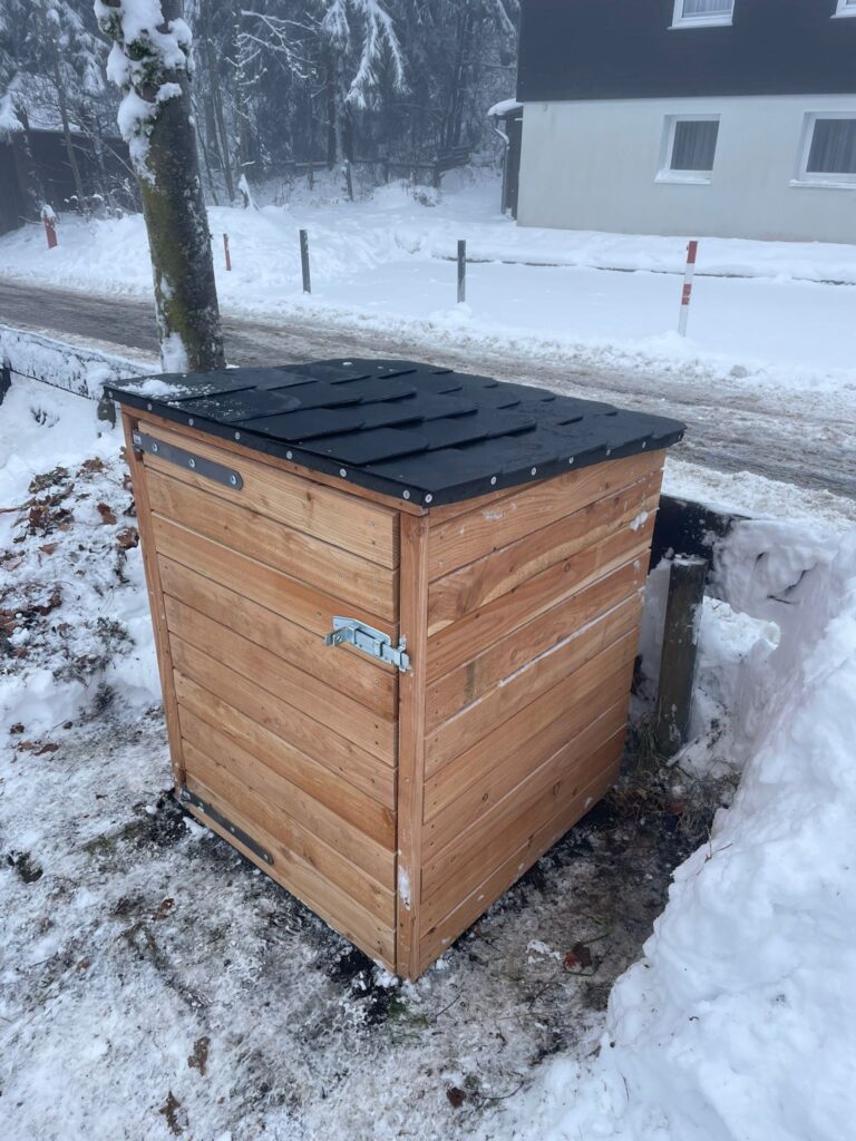 Großer Dank gebührt auch Thomas Krahnert und Thorben Ehlers, die einen stabilen und verschließbaren Unterstand aus Holz für die Mülltonnen an unserer Hütte gefertigt haben.